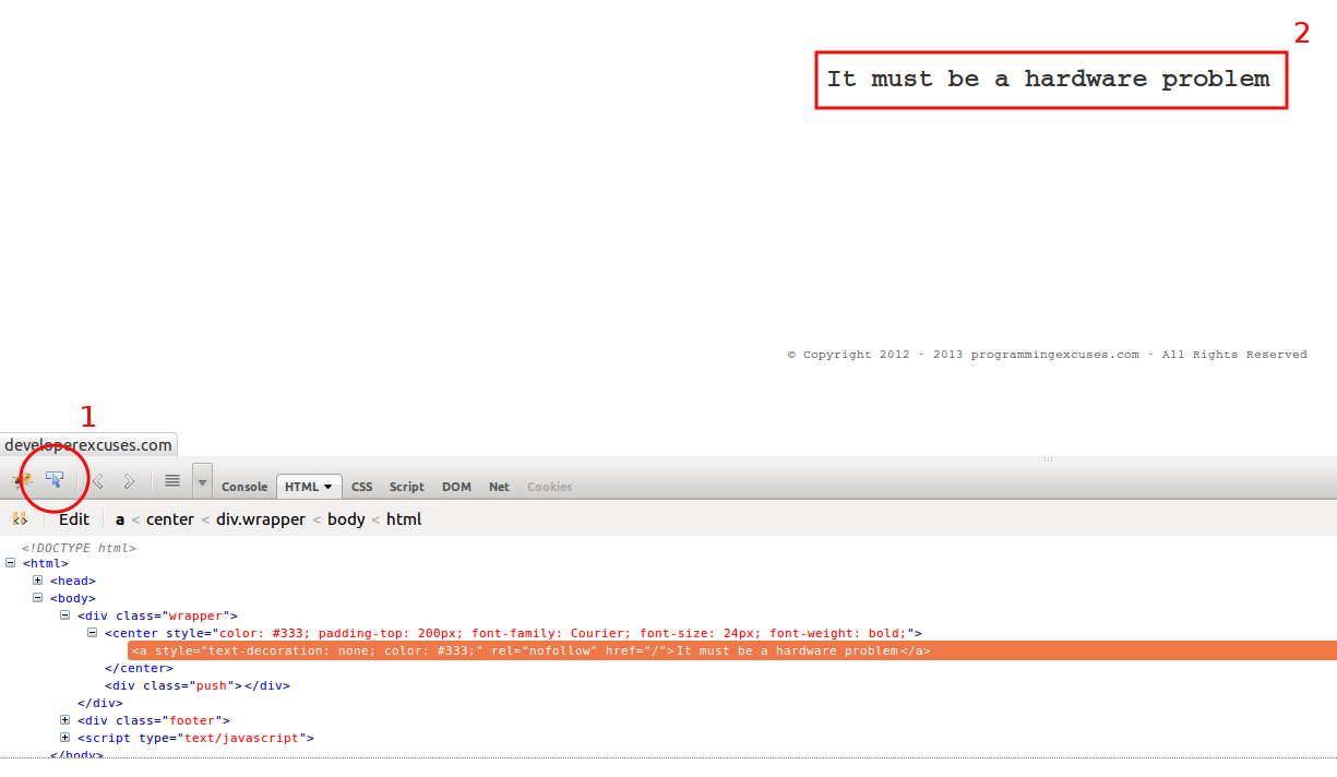 The page http://developerexcuses.com/ prints a funny line that developers can use as an excuse. Let’s extract this line.