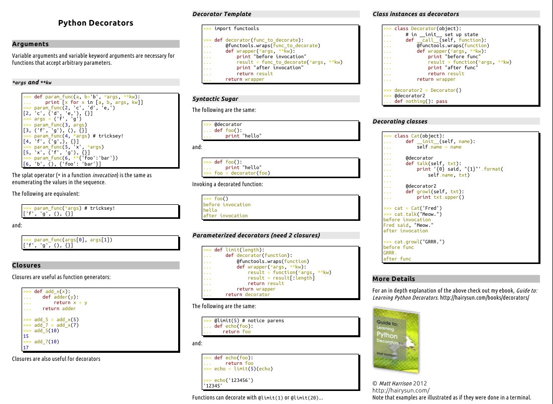 This is a cheat sheet for Matt Harrison’s book, Guide To: Learning Python Decorators. Here is a review.